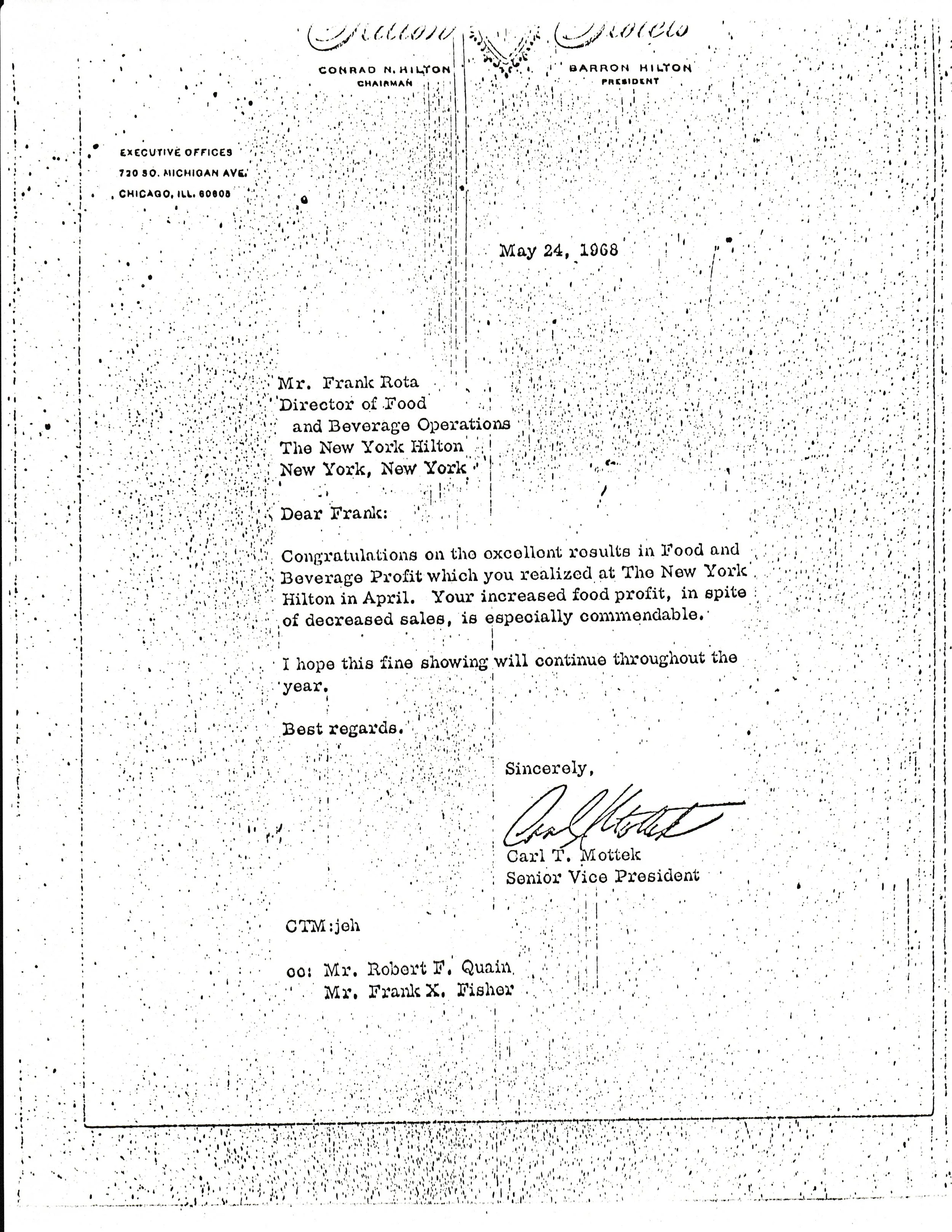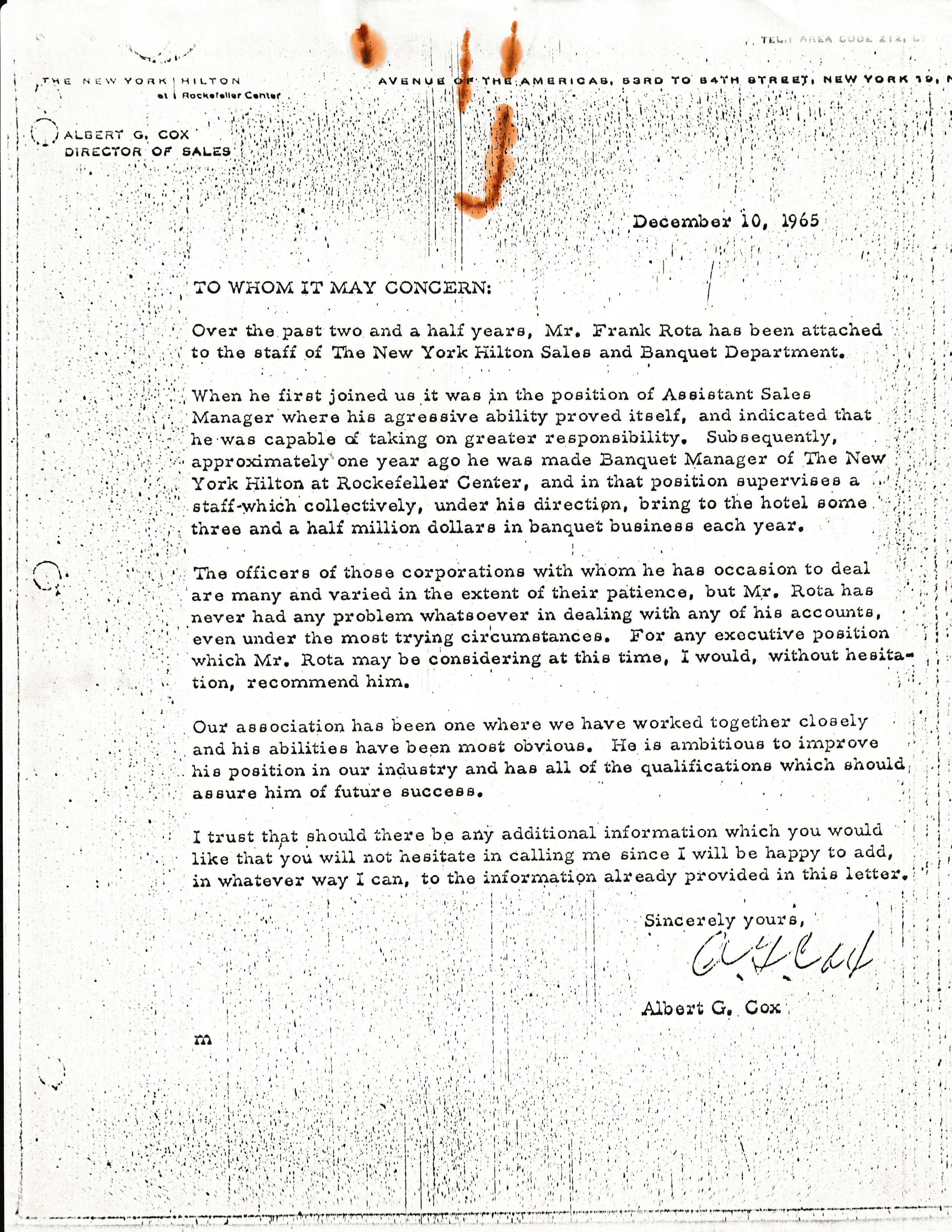 In April of 1962, Frank Rota joined the Hilton organization, starting in the role of Assistant Sales Manager. This recommendation letter, written three years into his time at the Hilton, highlights the successes and challenges he faced.
