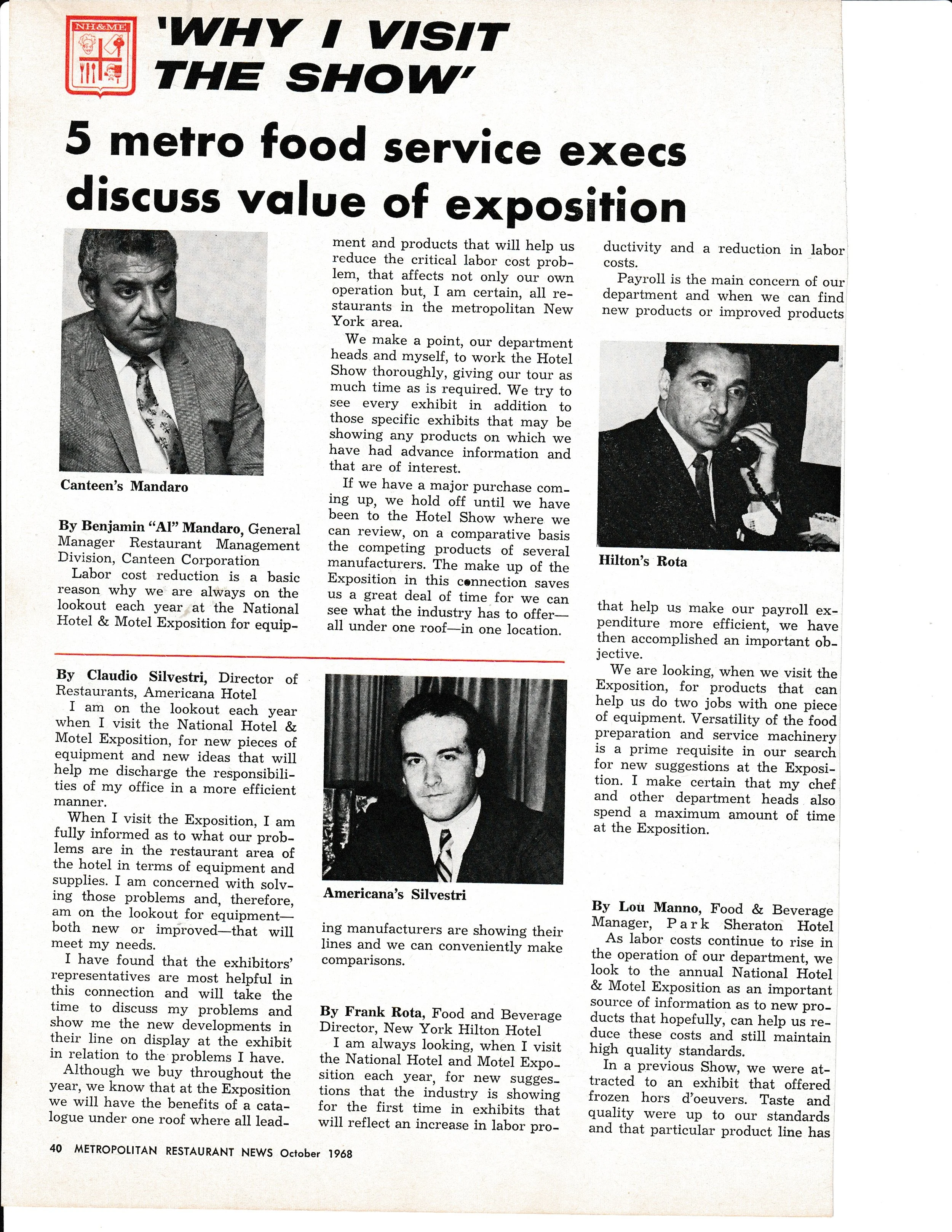 Frank Rota was promoted to Banquet Manager of the New York Hilton Rockefeller Center in October 1963, directing an operation that earned $3.5 million in annual business—an impressive figure for the time.