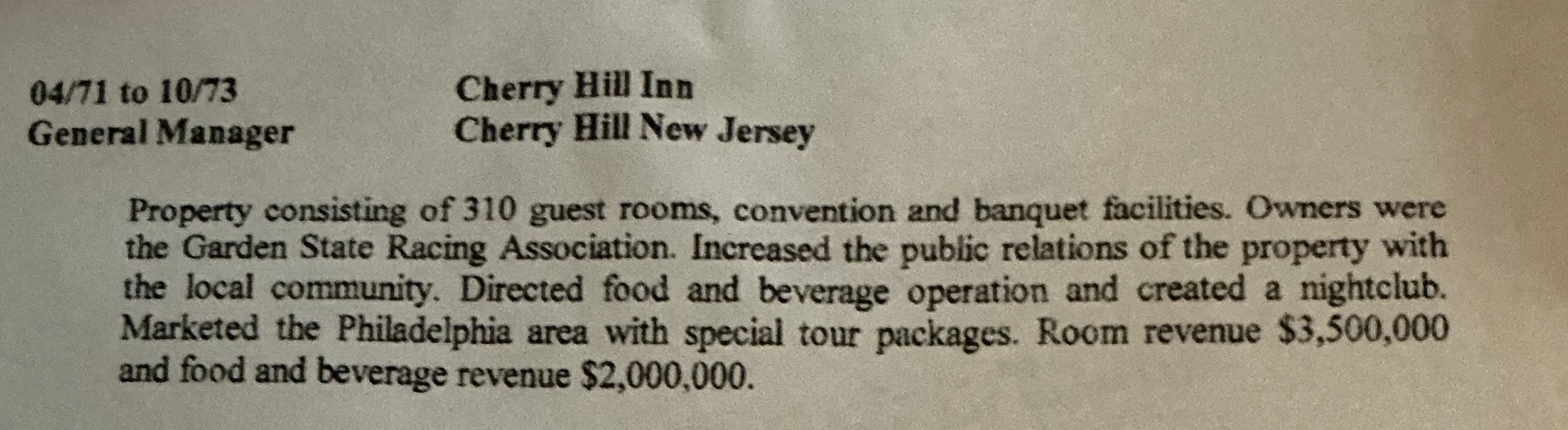 The Resume Line 04/71 – 10/73 General Manager Property consisting of 310 guest rooms, convention and banquet facilities. Owners: Garden State Racing Association. Increased public relations with the local community. Directed food and beverage operations and created a nightclub. Marketed the Philadelphia area with special tour packages. Combined room and F&B revenue: $2,000,000.