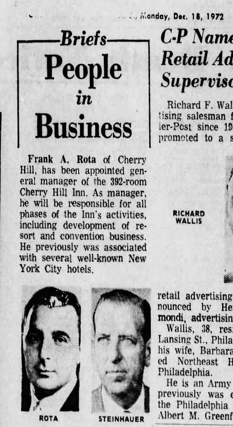 Today’s post focuses on Frank A Rota’s (Dad) second resume entry - The Cherry Hill Inn. We’ll touch upon the decision to leave the New York Hilton had to be a difficult one—though I suspect my father’s pride, ambition, and perhaps a bit of anger helped make it easier to accept a position outside of New York City. I was four when he sold our house in Verona for a deluxe apartment in the skies (of Cherry Hill, NJ). This time in my Dad’s work and home life was tumultuous, but he never lost sight of his career goals, and he was betting that the Cherry Hill Inn would crown him with the title he coveted.